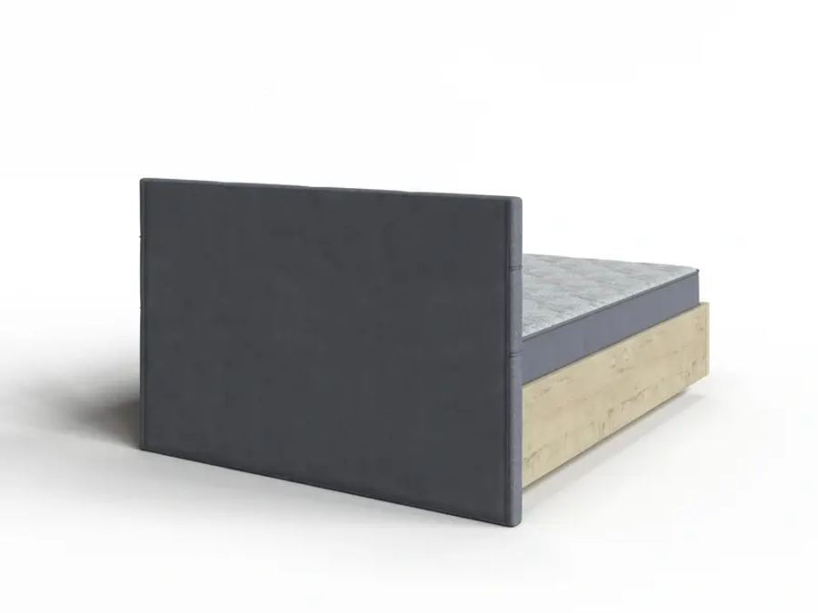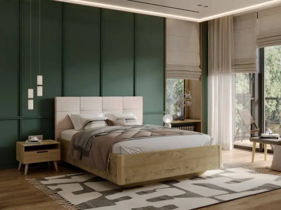 Кровать выполнена в сочетании мягкого изголовья и парящего царгового пояса из ЛДСП с угловыми элементами из массива березы.